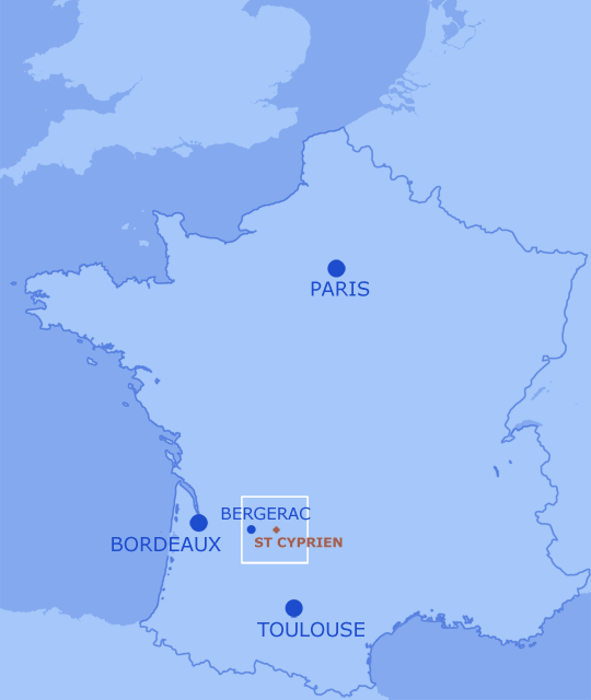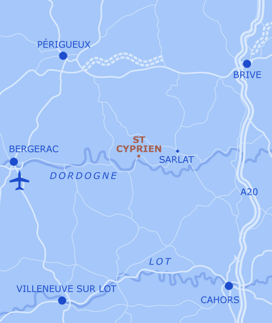 St Cyprien is 50 minutes from Bergerac Airport, 2.5 hours from Bordeaux and around 8 hours from Calais.